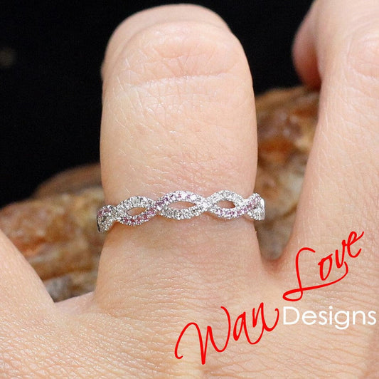 Infinity Twist Pink Sapphire Diamond Band, Round Twisted Curved Pink Moissanite Ring, Braided Wedding Band, Bridal Gold Birthstone Jewelry
