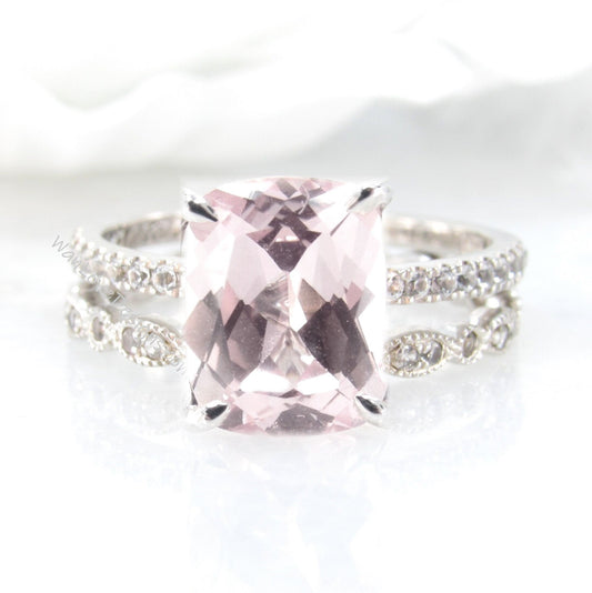 Light Pink Sapphire & Diamonds Elongated Cushion Engagement Ring Set Wedding Band Custom Anniversary Gift