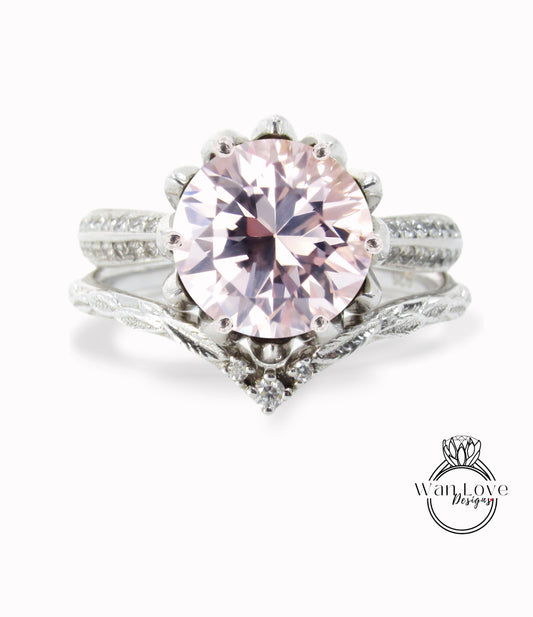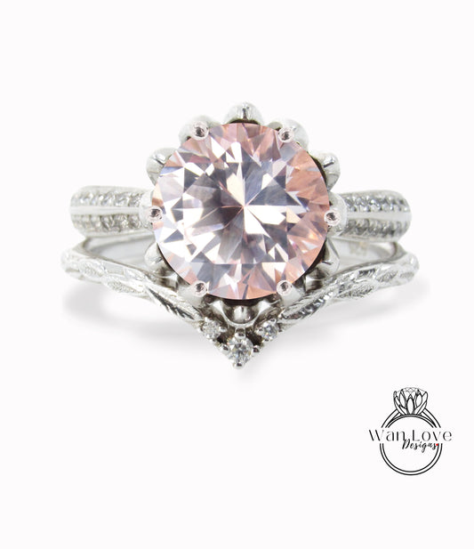 Lotus | 14K Gold Diamond Lotus Ring Set | Peach Sapphire 14k Flower Ring | Lotus Flower Ring Set | Curved Leaf Wedding Band | Bridal Gift