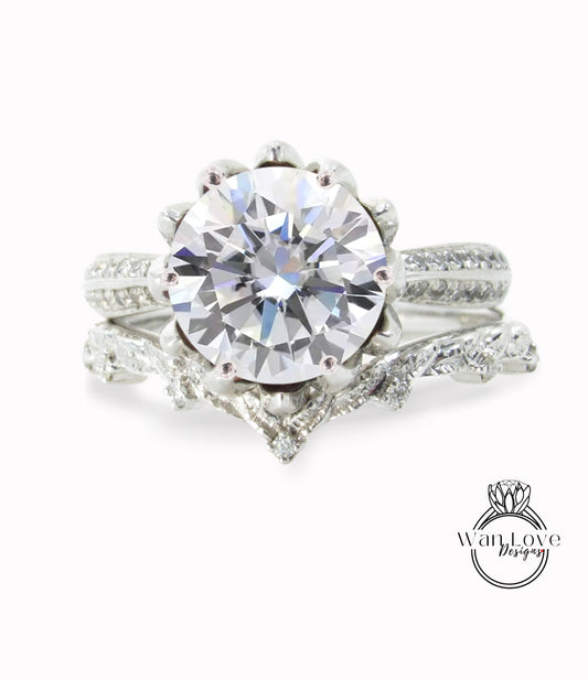 Lotus | 14K Gold Diamond Lotus Ring Set | Moissanite Flower Ring | Lotus Flower Ring Set | Curved Leaf Wedding Band | Bridal Gift