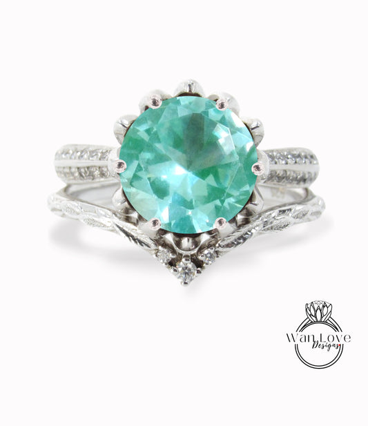 Lotus | 14K Gold Teal Blue Green Spinel & Diamond Lotus Ring Set | Teal Spinel Flower Ring | Lotus Flower Ring Set | Curved Leaf Wedding Band | Bridal Gift
