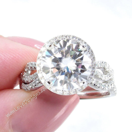 Moissanite & Diamond Infinity Split Shank Round Halo Engagement Ring, Contoured Wedding Band Custom 14k 18k White Yellow Rose Gold, Platinum