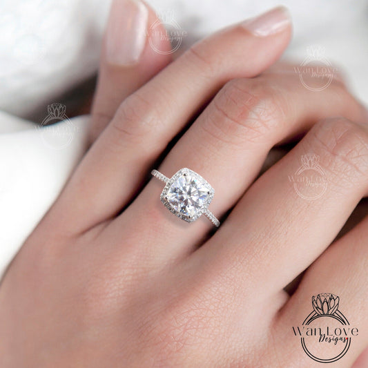 Moissanite & Diamond engagement ring unique cushion cut Vintage halo platinum wedding Bridal promise Anniversary ring wedding ring Ready