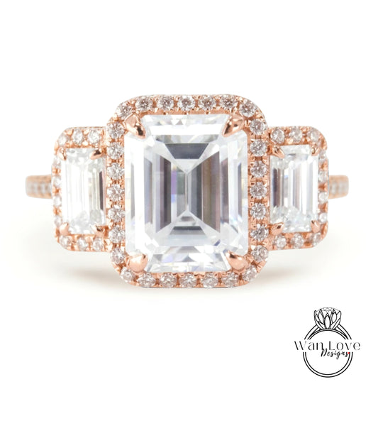 Moissanite & Diamonds Emerald 3 gem stone Engagement Ring Art Deco rose gold ring half moon trapezoid diamond triple halo bridal wedding ring anniversary gift