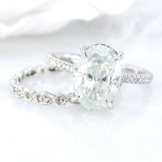 Moissanite Diamond Oval Leaf Antique Scalloped Engagement Ring, Milgrain Wedding Band set, 14k 18k White Yellow Rose Gold-Custom