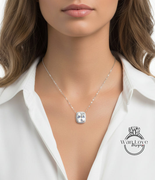 Moissanite Cushion Halo Diamond Necklace, Elongated Cushion Halo Necklace, Birthstone and Diamond Necklace, 18K White Gold Cushion Pendant