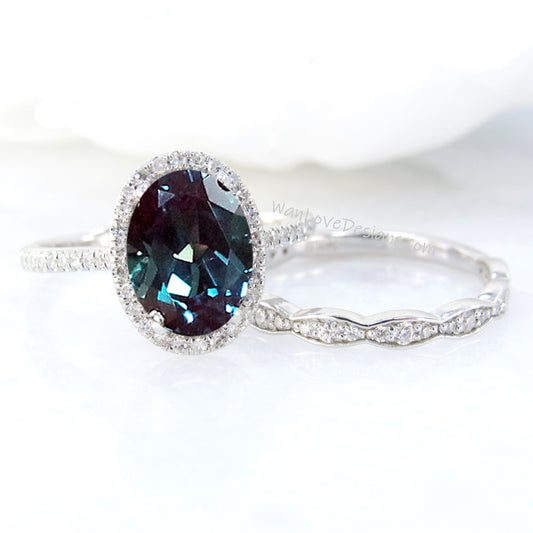 Alexandrite & Diamond Oval Cut Halo Engagement Ring Scalloped Wedding Band Set 14k 18k White Yellow Rose Gold-Wedding-Anniversary