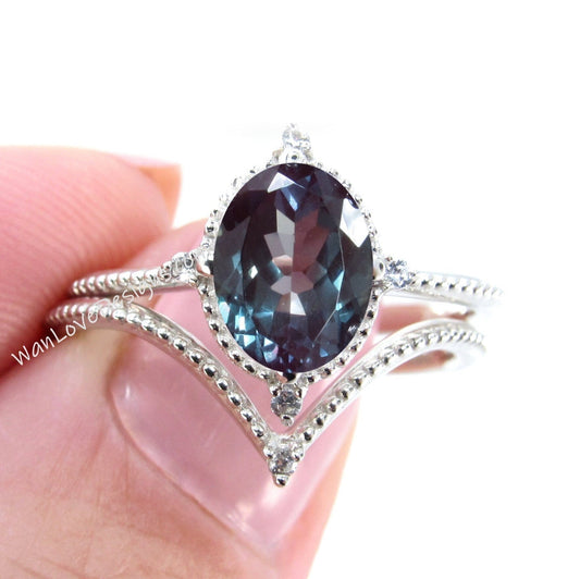 Alexandrite & Diamond Oval Milgrain Engagement Ring set V Wedding Band Custom,14k 18k White Yellow Rose Gold,Platinum