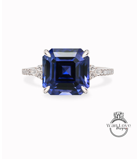 Blue Sapphire Asscher & Diamond Trio Pave Engagement Ring, Custom, 14kt 18kt Gold, Platinum, Wedding, Anniversary, WanLoveDesigns