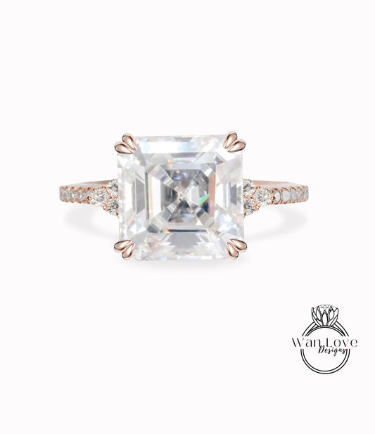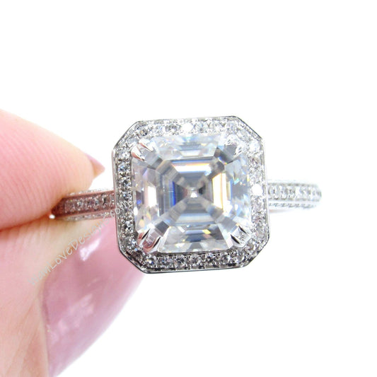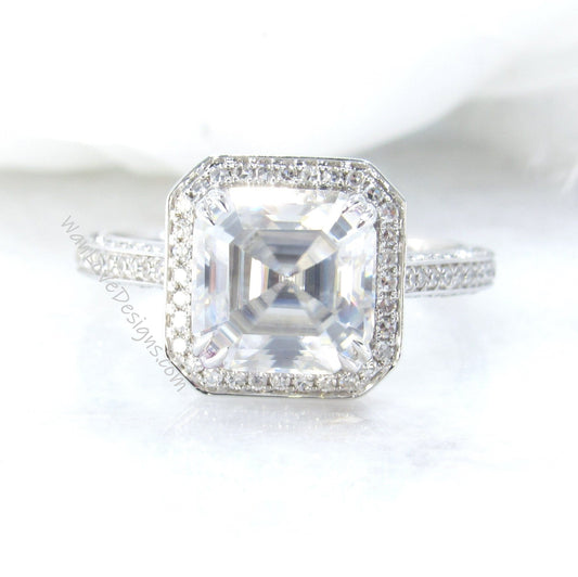 Moissanite & Diamond Asscher Halo Engagement Ring, 3 sided shank, Custom, Wedding,14k 18k White Rose Yellow Gold,Platinum
