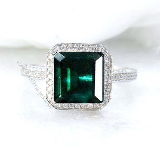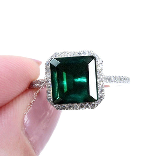 Emerald & Diamond Asscher Halo Engagement Ring, 3 sided shank, Custom,Wedding,14k 18k White Rose Yellow Gold,Platinum,Anniversary