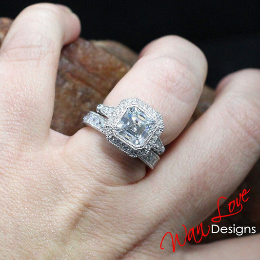 Moissanite Asscher Halo Engagement Ring, Milgrain, French Cut Wedding Band Set, 2.5ct, 8mm, Custom, White Gold, Ready to Ship