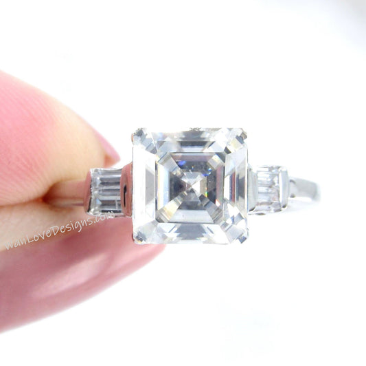 White Sapphire & Diamond Asscher Engagement Ring, Trio Gem, Custom, 14kt 18kt Gold, Platinum, Wedding, Anniversary, WanLoveDesigns