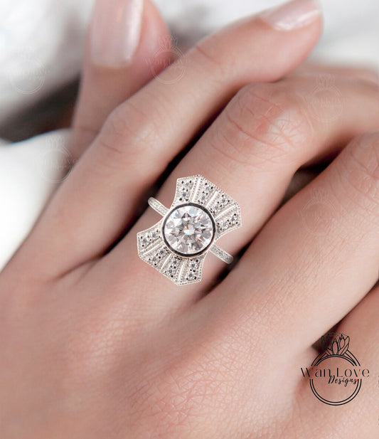 Vintage Diamond Moissanite Engagement Ring Art Deco halo ring Milgrain round bezel ring unique halo ring wedding Anniversary promise ring