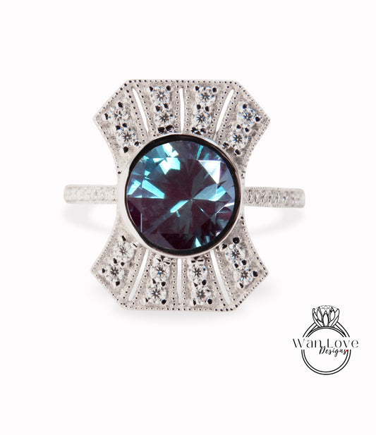 Vintage Diamond Alexandrite Engagement Ring, Art Deco moissanite halo ring, Milgrain round bezel ring, Alexandrite ring with Diamonds