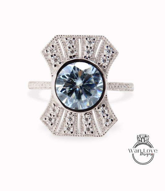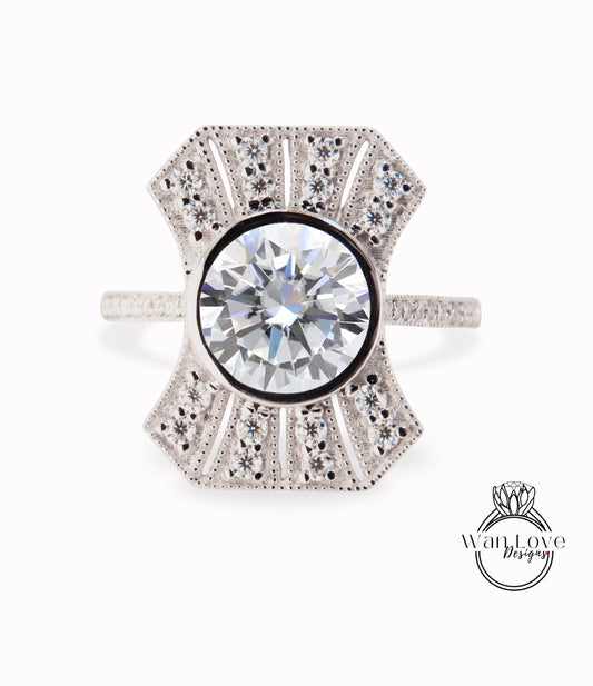 Vintage Moissanite Engagement Ring, Art Deco halo ring, Milgrain round bezel ring, Moissanite ring, 2ct, 8mm, Ready to Ship