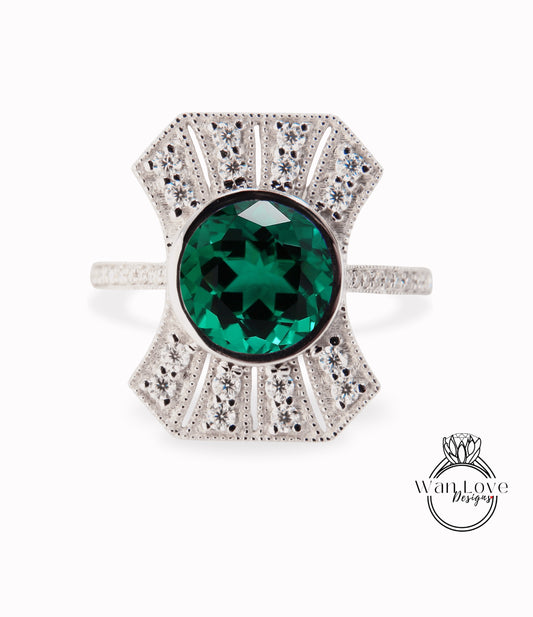 Vintage Diamond Emerald Engagement Ring, Art Deco moissanite halo ring, Milgrain round bezel ring, Antique Green ring with Diamonds halo