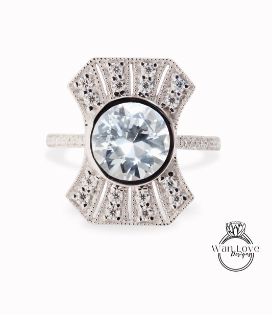 Vintage Diamond White Sapphire Engagement Ring, Art Deco Moissanite halo ring, Milgrain round bezel ring, Sapphire ring with Diamonds