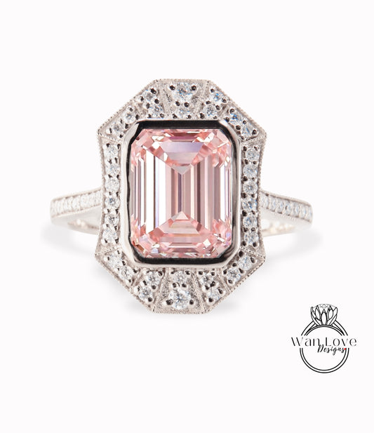 Art Deco Halo Peach Sapphire & Diamond Emerald cut Ring, Milgrain Bezel Halo Ring, Sapphire Moissanite Ring, Vintage Inspired Ring