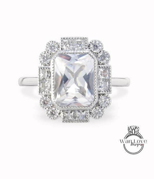 White Sapphire Emerald Milgrain Bezel Princess Round Halo Engagement Ring Antique Moissanite Custom Wedding