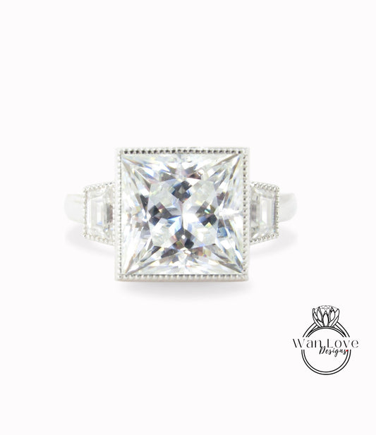 Moissanite 3 Gem Princess Trapezoid Bezel set Engagement Ring, Custom, Wedding, 14kt 18kt Gold, Platinum, WanLoveDesigns