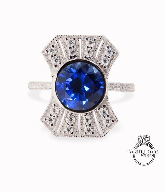 Vintage Diamond Blue Sapphire Engagement Ring, Art Deco moissanite halo ring, Milgrain round bezel ring, Sapphire ring with Diamonds