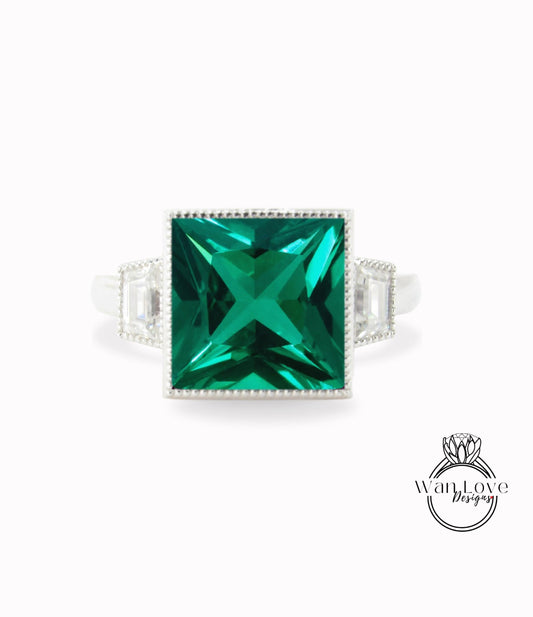 Emerald Milgrain Bezel Princess Round Halo Engagement Ring Antique Moissanite Custom Wedding
