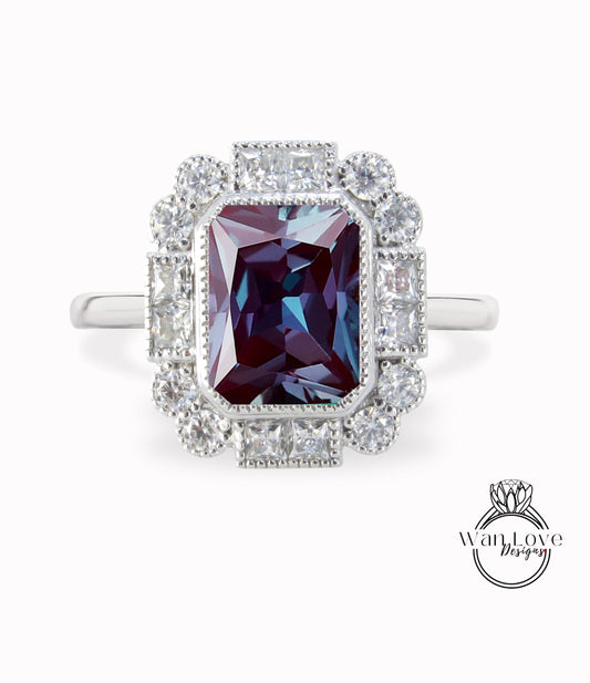 Alexandrite Emerald Milgrain Bezel Princess Round Halo Engagement Ring Antique Moissanite Custom Wedding
