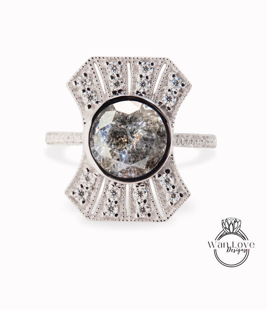 Vintage Salt & Pepper Diamond Engagement Ring, Art Deco salt and pepper halo ring, Milgrain round bezel ring, Moissanite ring with Diamonds