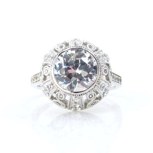 White Sapphire Antique Bezel Filigree Engagement Ring, Milgrain Detail, Scrolls, 2ct, 8mm, Silver Rhodium, Anniversary gift, Ready to ship