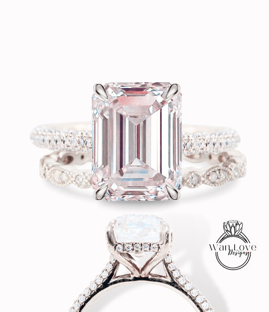 Light Pink Sapphire & Diamond Emerald Side Halo Engagement Ring Set Almost Eternity 3 sided shank Celebrity Style Bridal Wedding Band Ring set Custom Anniversary Gift