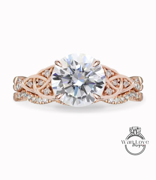 Diamond Celtic knot Infinity Round engagement ring set rose gold curved nesting wedding band antique bridal set anniversary gift
