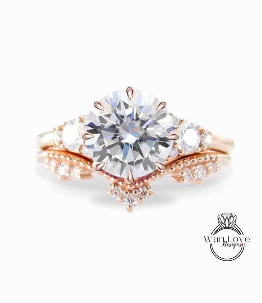 Unique Rose gold Diamond engagement ring set Round Cluster Royal ring Round women Curved crown IGI HPHT CVD Diamond wedding Band Bridal gift