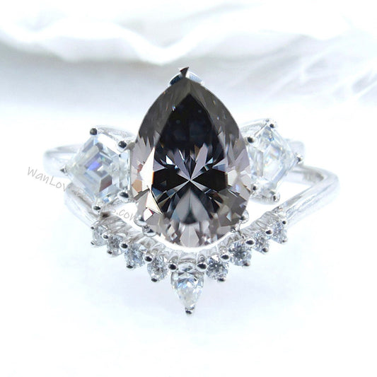 Gray Moissanite cluster pear kite engagement ring, cluster ring, moissanite ring, moissanite kite ring, unique engagement ring, Bridal Set