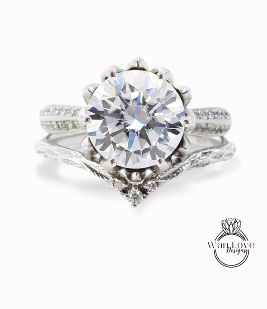 White Sapphire Engagement Ring Set, Unique Floral Design, Tropical, Cushion, Wedding Band,3ct 8mm-14k White Yellow Rose Gold-Platinum-Custom