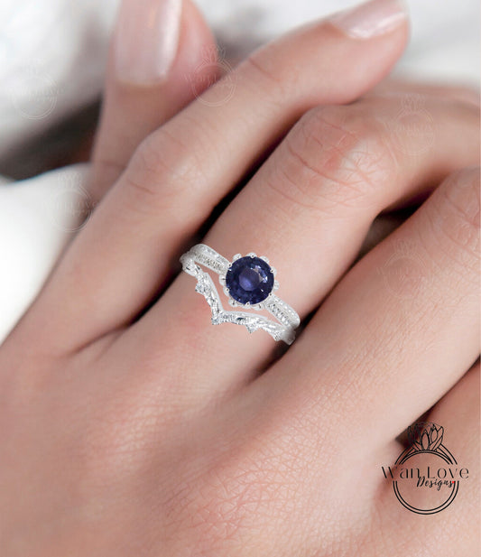 1.65ct Blue Sapphire diamond Lotus ring set - engagement ring wedding band- leaves bridal ring- diamond wedding ring- flower engagement ring