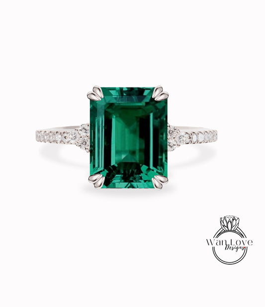 Emerald cut Green Emerald engagement ring vintage diamond Cluster gold engagement ring for women Bridal anniversary gift for her