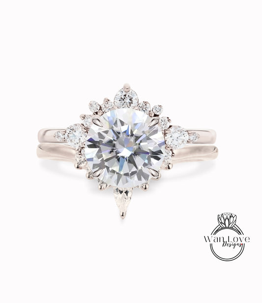 Moissanite & Diamond engagement ring set Half Halo Round Cluster Unique ring women vintage Pear shaped wedding Anniversary gift