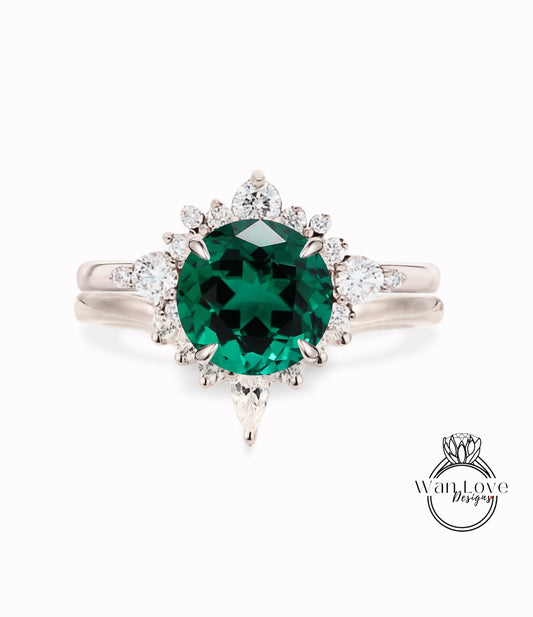 Emerald & Diamond engagement ring set Half Halo Round Cluster Unique ring women vintage Pear shaped wedding Anniversary gift