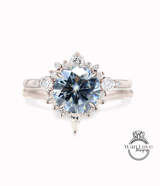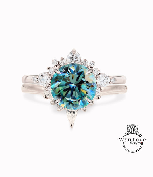 Blue Green Teal Moissanite & Diamond engagement ring set Half Halo Round Cluster Unique ring women vintage Pear shaped wedding Anniversary gift