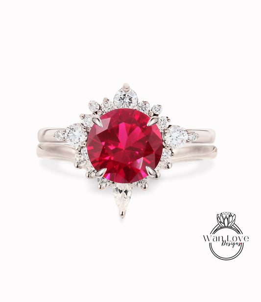 Ruby & Diamond engagement ring set Half Halo Round Cluster Unique ring women vintage Pear shaped wedding Anniversary gift