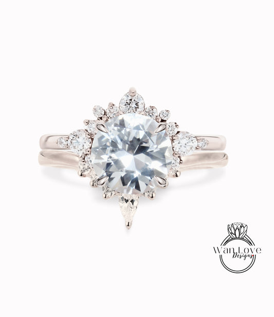 White Sapphire & Diamond engagement ring set Half Halo Round Cluster Unique ring women vintage Pear shaped wedding Anniversary gift