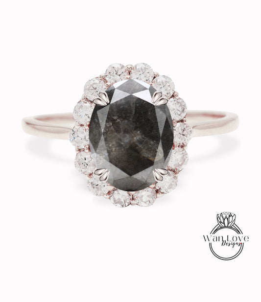 Salt & Pepper Diamond Oval Engagement Ring vintage Unique Round halo diamond Cluster ring Rose gold ring antique diamond Bridal ring Anniversary gift