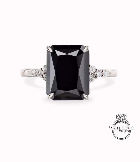Black Spinel engagement ring vintage Emerald cut Moissanite diamond Unique Cluster rose gold engagement ring Bridal promise gift