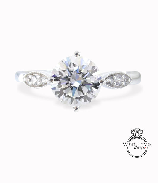 Diamond Engagement Ring, Milgrain Leaf Nature Round Antique Vintage style, 14k 18k White Yellow Rose Gold-Platinum-Custom