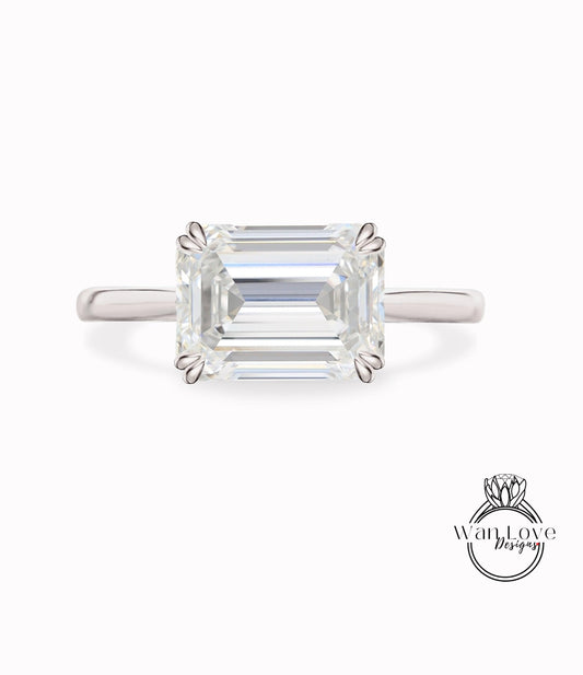 East West Emerald Diamond engagement ring white gold solitaire double prong ring vintage wedding art deco Bridal Promise Anniversary ring