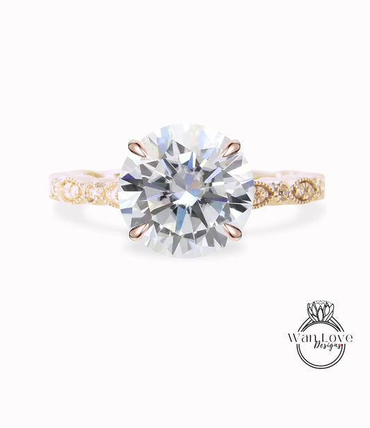 Vintage Style Scalloped Round Diamond Engagement Ring, Solitaire Round Diamond Antique Style milgrain Ring, Solid 14k gold engagement ring with IGI lab diamonds