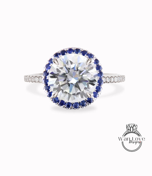 Diamond & Blue Sapphire Round Halo Engagement Ring Certified Diamond 14k 18k White Yellow Rose Gold-Platinum-Custom-Bridal Wedding ring Anniversary gift