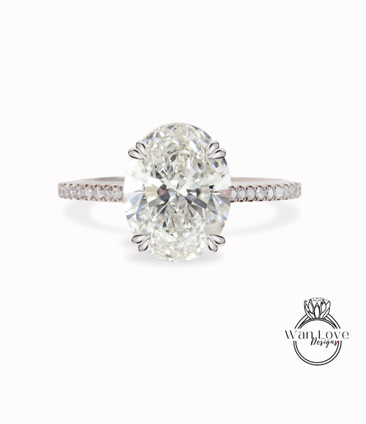 Lab Diamond engagement ring White gold vintage Oval cut ring hidden side Halo diamond Half eternity IGI Diamond Wedding Anniversary ring