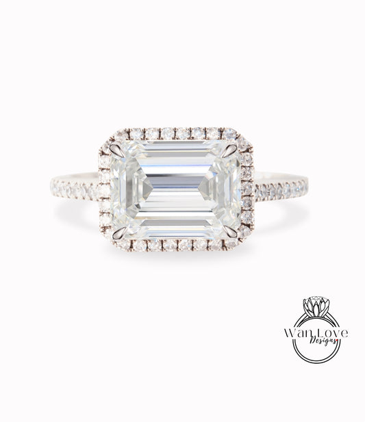 East West Emerald cut Diamond Side halo engagement ring Tapered plain band Lab Diamond ring rose gold prong ring Art deco Solitaire wedding bridal Anniversary promise